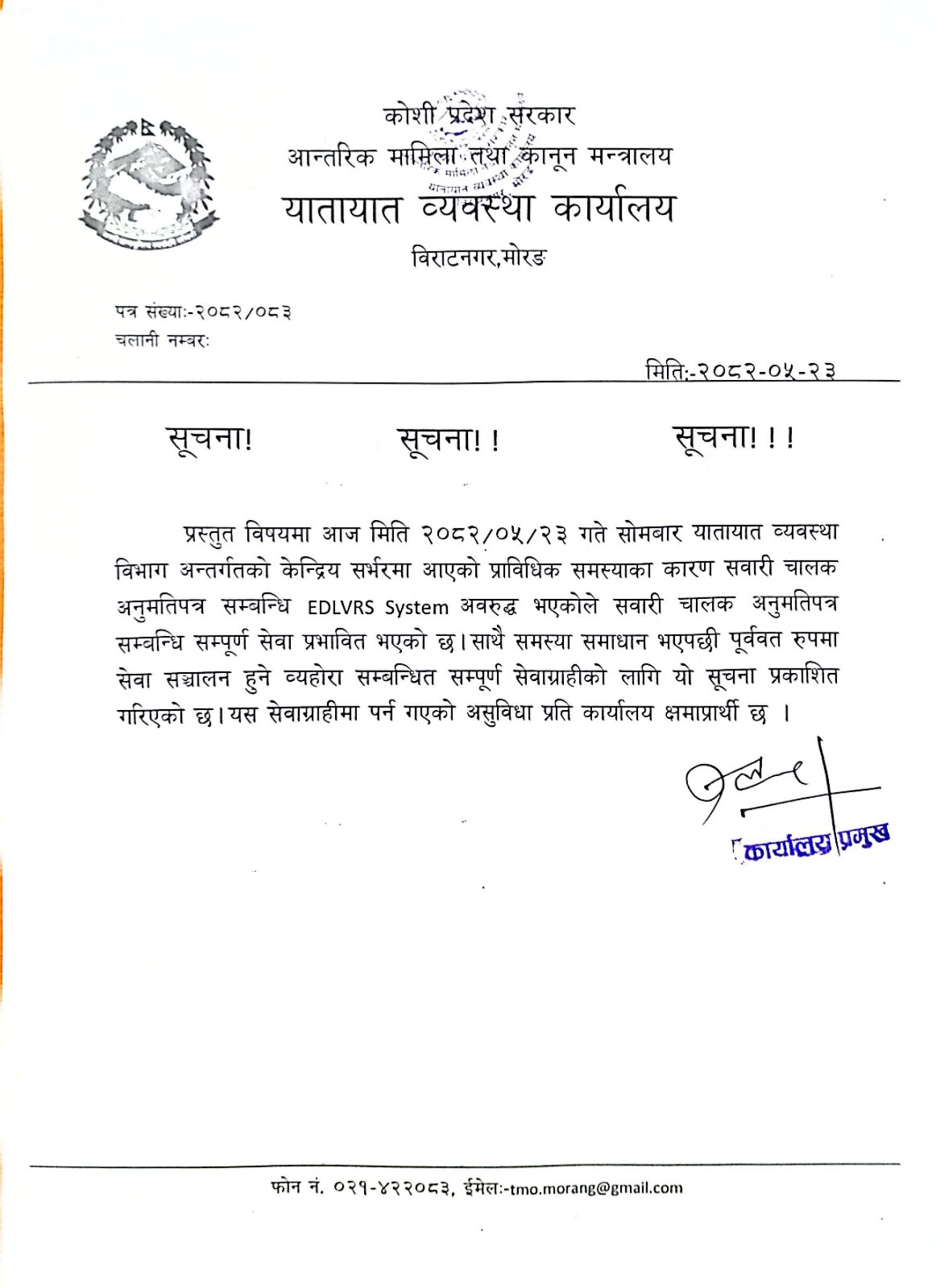 यातायात व्यवस्था सेवा कार्यालय,बिराटनगर । यस कार्यालयको स्थापना २०७१ साल फागुन १४ गते भएको हो ।